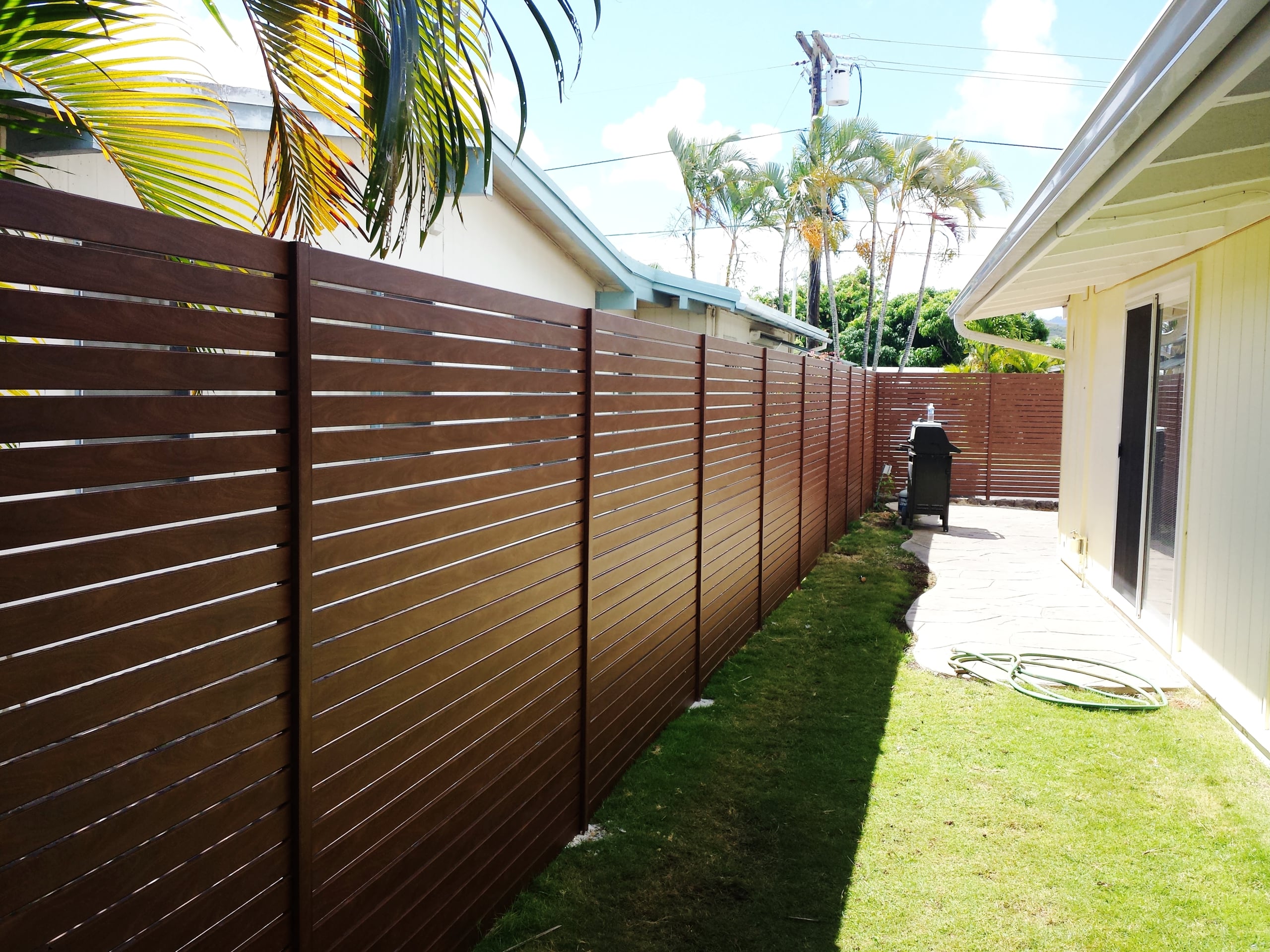 A beachfront home had a redwood fence that was deteriorating due to constant salt spray. The repair process included replacing rusted nails with stainless steel ones and sealing all joints.